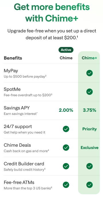 If you already direct deposit $200 or more within the preceding 34-days, you’ll automatically get access to Chime+ benefits! Please keep in mind that if you’ve already enrolled in SpotMe® or MyPay®, your SpotMe2 limits and MyPay1 Available Now limits won’t change due to the addition of Chime+. Learn more at How is my MyPay® Available now amount determined?